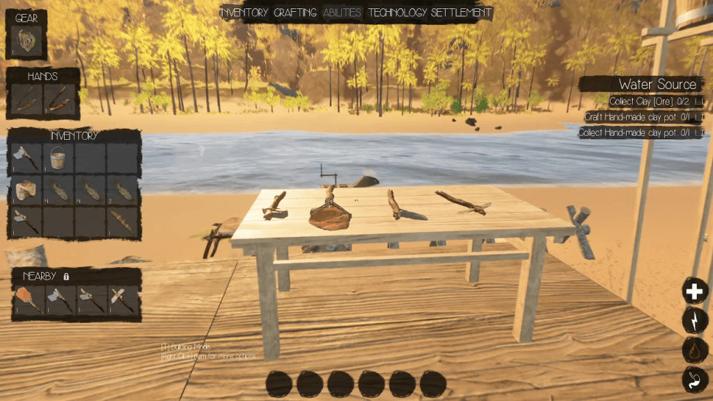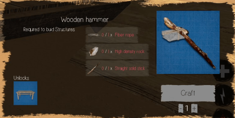 You start off on the beach of the island and are tasked immediately with crafting the basic tools available to the player such as a backpack to increase inventory space, an axe to chop down trees, a pickaxe to mine ores, a shovel to gather resources, and a hammer to build structures.