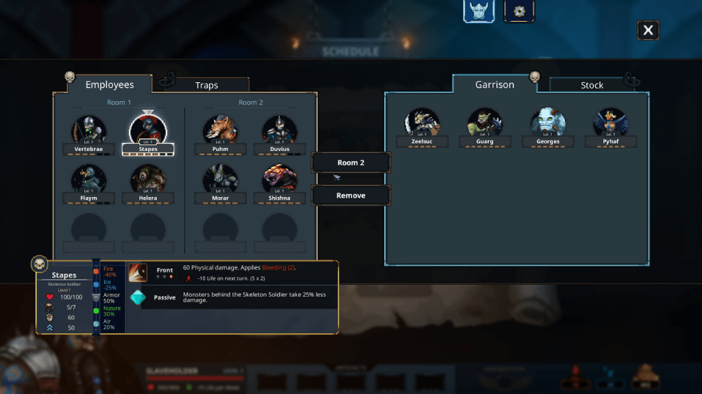 In between fending off adventurers, you can train and hire new employees, buy and upgrade traps, and manage your workplace which often ends up with finding random artifacts as well as buffing or debuffing your employees through happenstance.