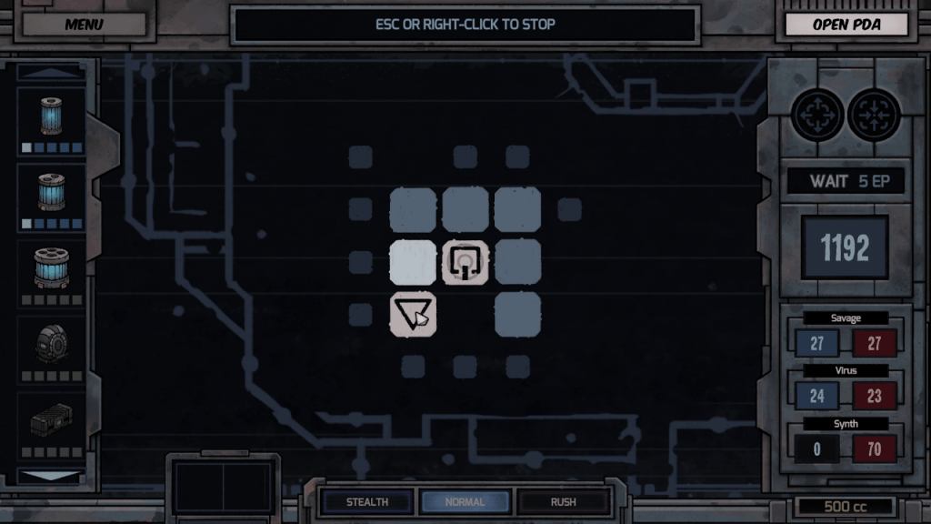 Movement throughout the ship costs energy, which is depleted from a pool. You can also scan the available rooms near you to see what they contain. Doing so saves time and energy compared to exploring each room manually. As your explore the ship and deplete your energy, you must return before the energy is completely depleted. This limits your run through levels and completing each level requires some strategizing of how to spend your resources. The energy is not replenished and must be restored by spending money or using items.