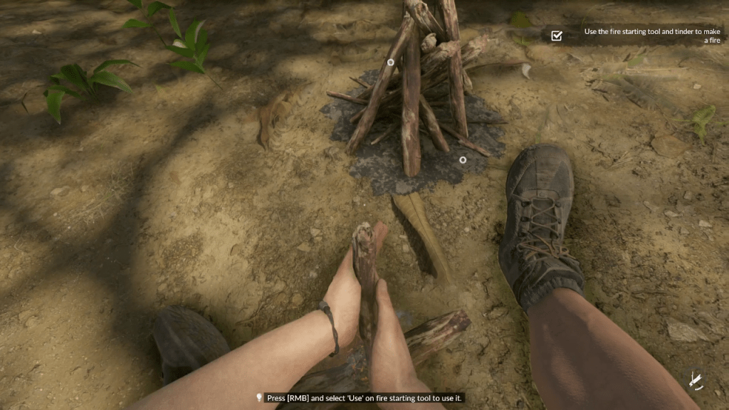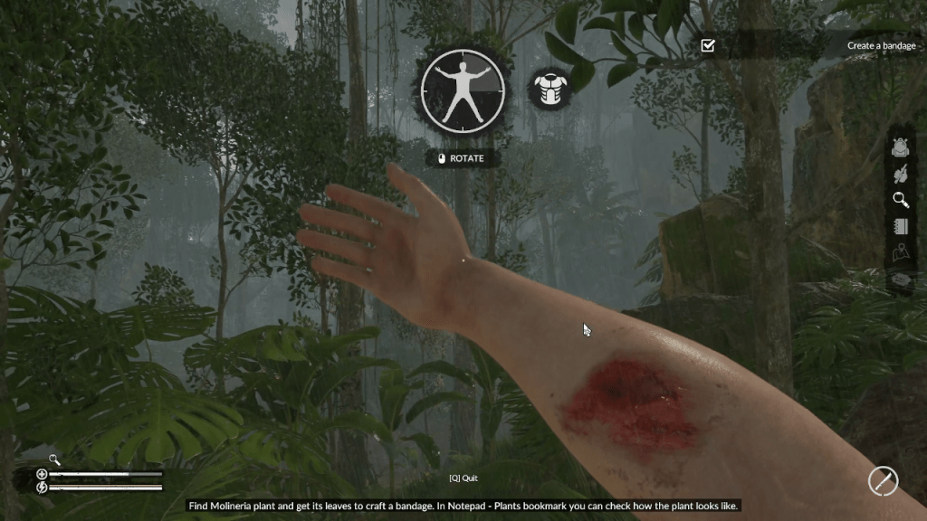 The crafting is pretty standard with recognizable structures such as beds, shelters, water collectors, furnaces, and etc. A new and unique feature is the ability to inspect your own body for injuries and afflictions. Sometimes you get leeches, which you have to pluck off. Sometimes if you take a fall, you will get an abrasion and you will need to wrap it in a bandage or else it will get infected and fester. Once that happens, you need to find maggots to help eat away at the necrotic flesh. Maggots can be harvested on animal corpses. Drinking contaminated water will infest you with parasites, which can be killed by eating the right plants, such as certain mushrooms.
