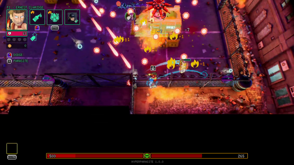 HyperParasite is a rogue-lite twin stick shooter. You play as a parasite in a retro future city that has the ability to take over hosts and use their abilities to defeat enemies.