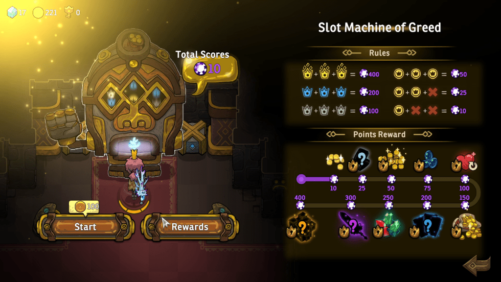 Other possible room encounters include a slot machine to gamble coins for a chance of better loot, treasure rooms to unlock random relics, challenge rooms, chances to roll for permanent stat buffs at the risk of getting permanent debuffs, and so on.