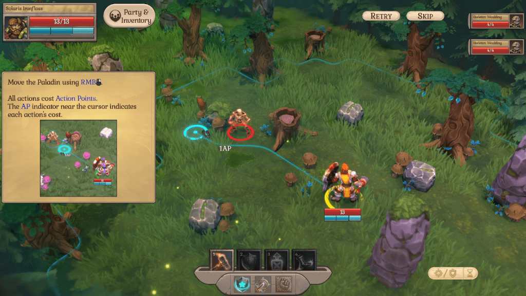 The combat phase has mechanics that turn based strategy veterans will be immediately familiar with. Most actions take action points. Each character starts with three action points. Moving within range costs one, moving outside that range takes two, and most attacks take two action points. Abilities have a cooldown based on a number of turns.