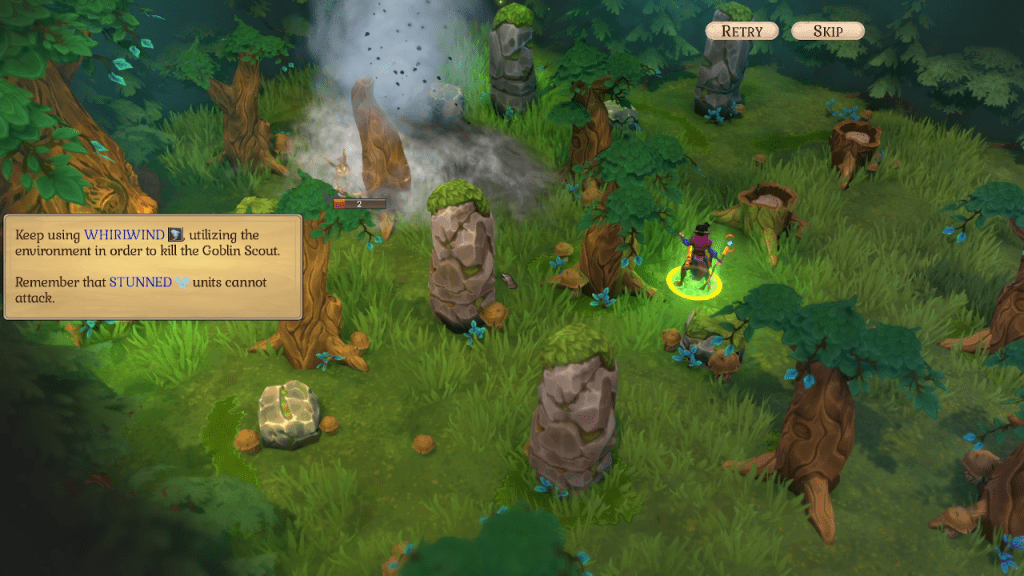 For Triumph, however, adds in a pretty unique mechanic. Most characters have a physics based ability that interacts with characters, enemy, and the environment. It feels a little bit similar to Disgaea, another turn based strategy game near and dear to my heart. You can lift players and objects, you can kick things across the map, or into enemies, you can cast whirlwinds to knock trees onto goblins, and you can even grapple two enemies into each other.