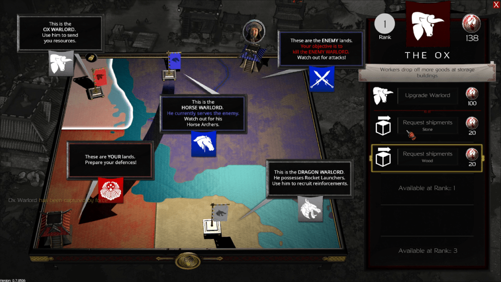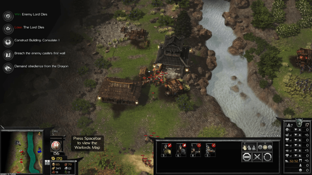 The demo starts you off in an already built village. Access to resources is fairly easy so you can focus on the warring part of being a warlord. You have access to melee, ranged, cavalry, and siege units. They all have different movement speeds so you have to do a little bit of micromanaging so the fast units don’t go off charging across the battlefield on their own, getting killed immediately.