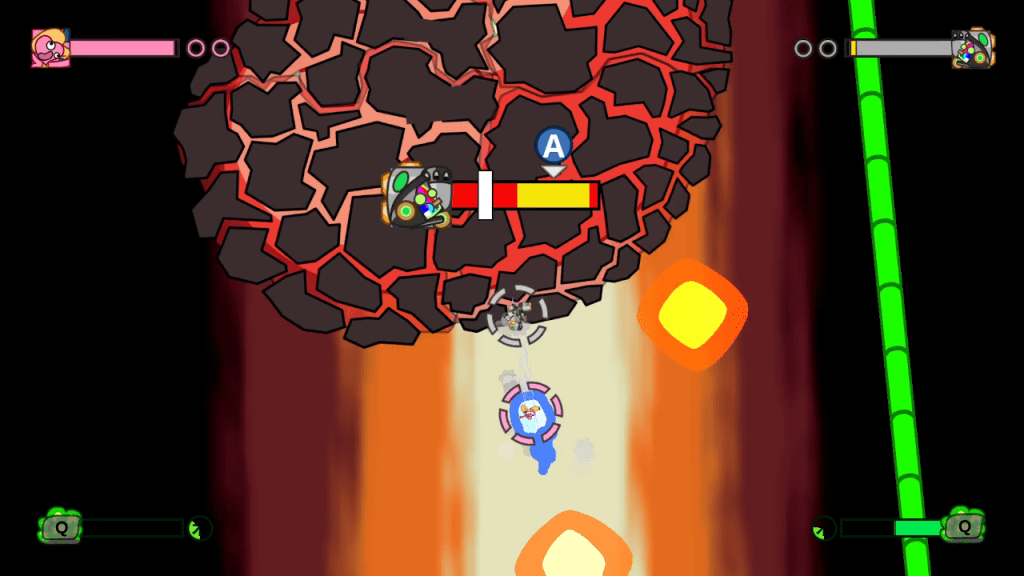 In addition to the regular combat mechanics, the game throws in more mayhem by letting you ram into objects on the map to fling large and comical items at your opponents, such as giant whales. You can also activate traps on the map as well. Once you are damaged enough and are flung into the environment, some areas on the map will trigger environmental traps. A skill check will pop up and if you miss it, it will result in immediate, and comical, death.