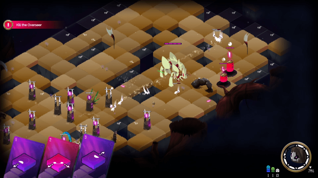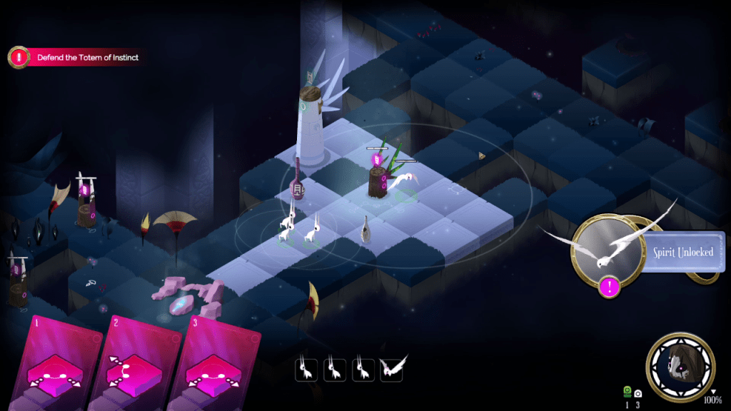 The cards are how you create the buildings, which will spawn units to engage the enemy. Spirit Oath has an interesting system where you align symbols to create the buildings that you desire. The more rarer the unit, the larger the symbol required to spawn the building. For example, the base unit, the bunny, only requires two matching tiles to create the building. The flying unit requires three.