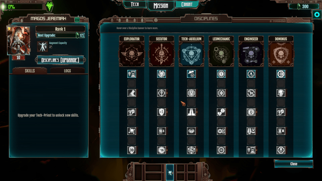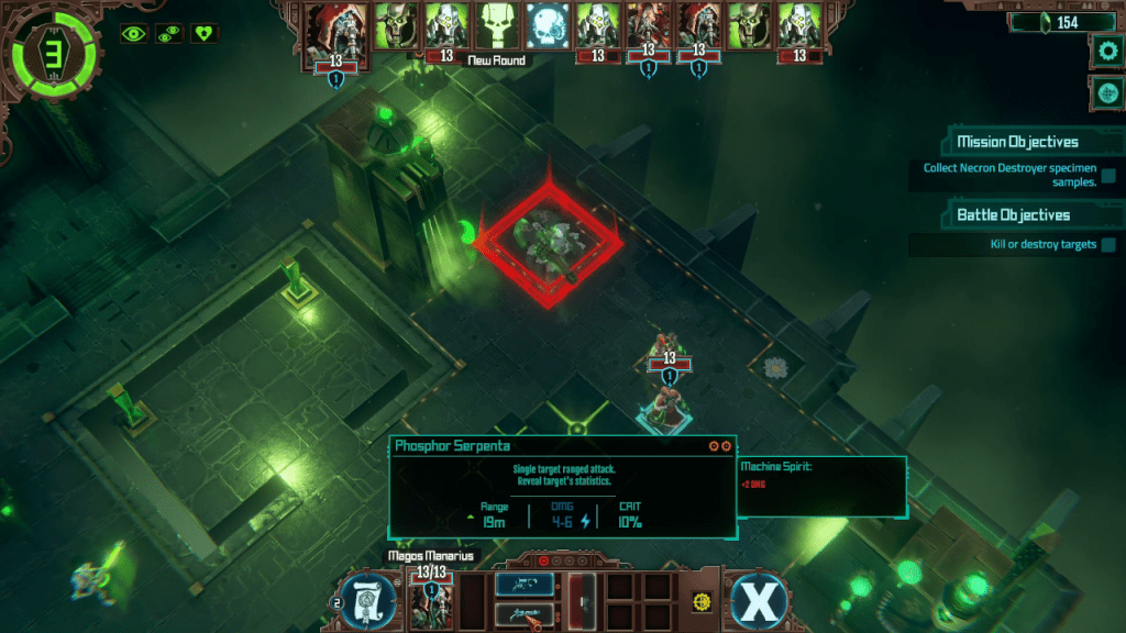 The combat phase is pretty standard turn based strategy fare with some of the mechanics similar to other games of the genre such as opportunity attacks. The way that Mechanicus differs, is in the usage of cognition points, or the game’s version of action points. Instead of gaining action points every turn, you must take actions to obtain cognition points. Basic movement and weak attacks do not cost cognition points but anything beyond that will. This creates an interesting ebb and flow to the combat as you have to keep track of how many cognition points you have, whether or not to take action to earn cognition points, and where to spend them.