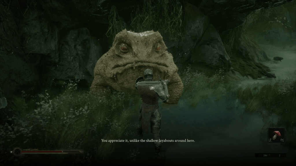 The game also has a surprising amount of lore in the background of the game. You’ll be able to find many quest items and collectables, as well as meet interesting npcs, like the giant toad gentleman, Gorf, and the fancy merchant Vlas. Much like most things in the game, Mortal Shell doesn’t hold your hand for anything and leaves it up to you whether you explore enough to find out these interesting tidbits. The first time I played, I managed to skip the first section entirely and accidentally made my way to a harder zone. Doing so leaves me without the ability to parry.