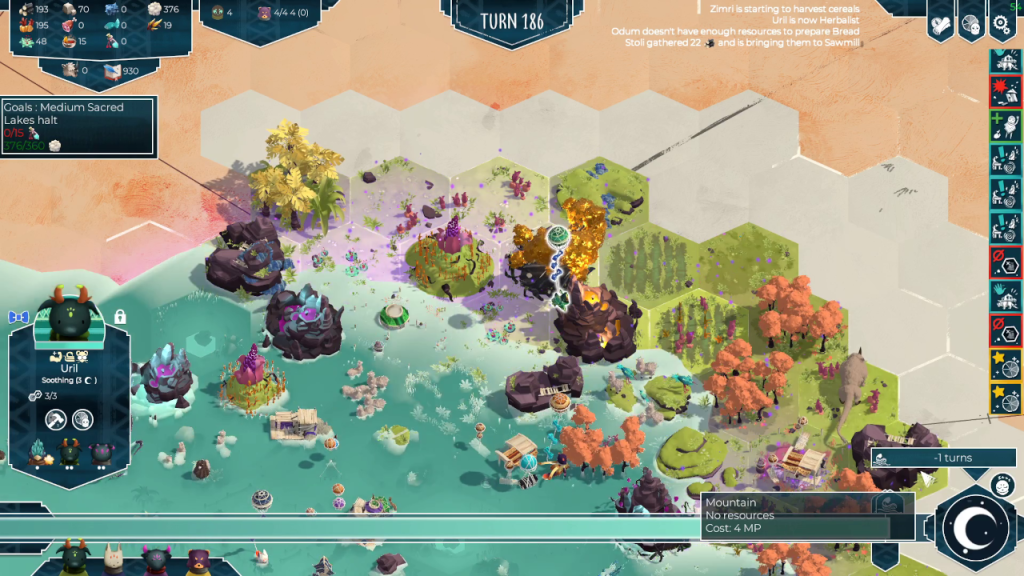 In order to do so, you have a limited number of turns to gather the necessary resources to proceed to the next area. Each pupil consumes food every turn so it is a constant battle of collecting enough food to feed your tribe and assigning enough workers to harvest the necessary resources before time runs out.