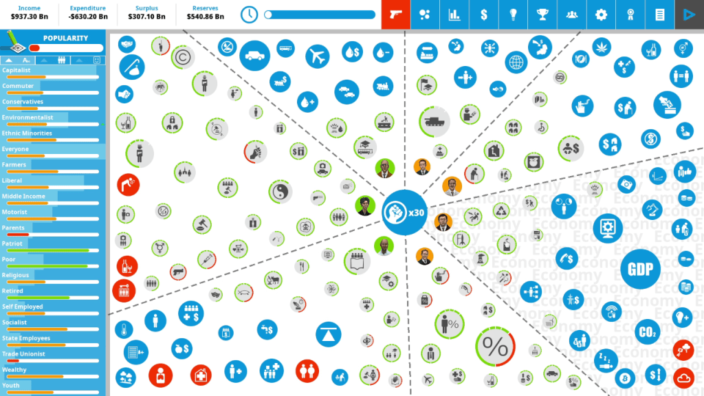 Democracy 4 is a political simulator where you play as the majority party getting ready for the election. The game is turn based and each turn you gain political capital, which are essentially points you can spend to take actions.