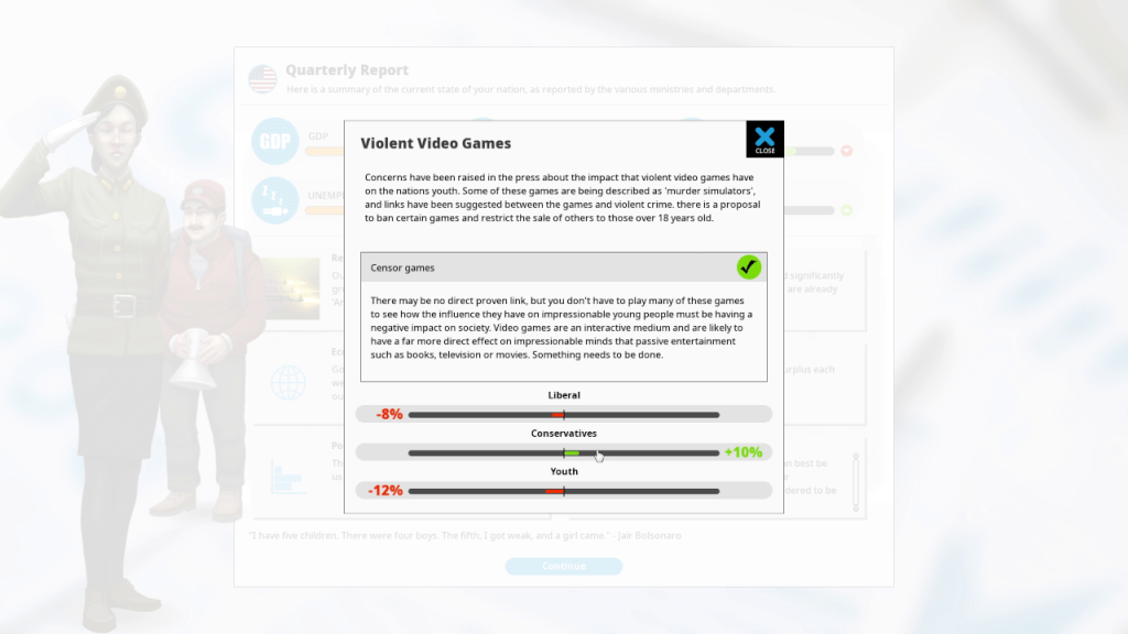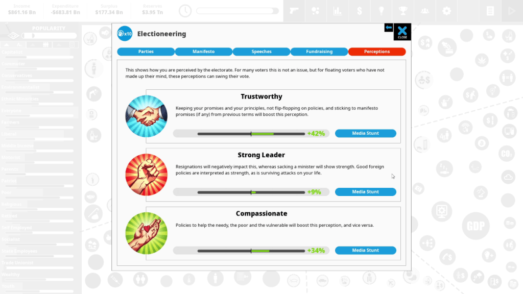 Overall, Democracy 4 is a decent political sim. I do have one small issue in that the balancing seems to heavily favor perception over anything else. By spending a small amount of political capital increasing perception, I was able to win the election every single time no matter how good or bad my policies were. I guess this is more aligned with reality than people realize but it does make the other mechanics available in the game feel a little underwhelming.