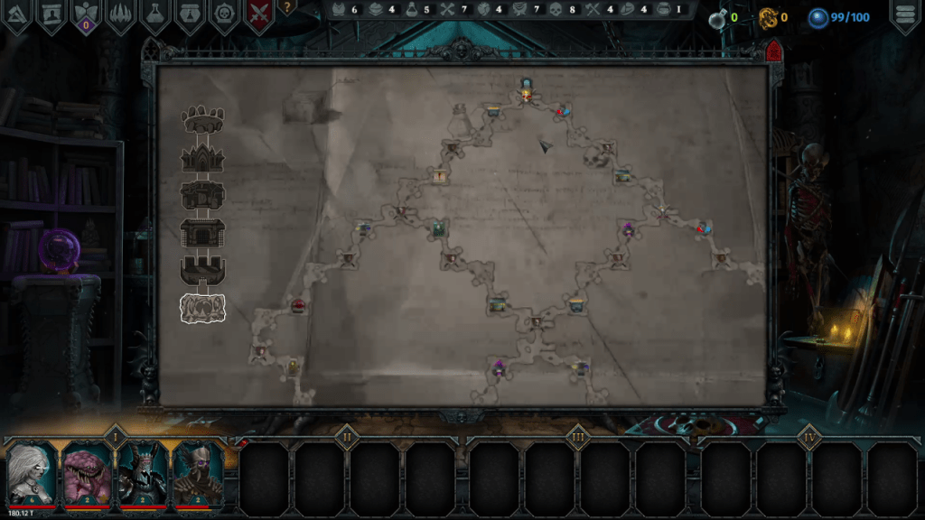 The game has a main hub where you can craft monsters, potions, and items. You also have a graveyard where you can upgrade passive bonuses by using souls. The map is an maze of branching paths with a random assortment of encounters aside from battles, such as finding new artifacts.
