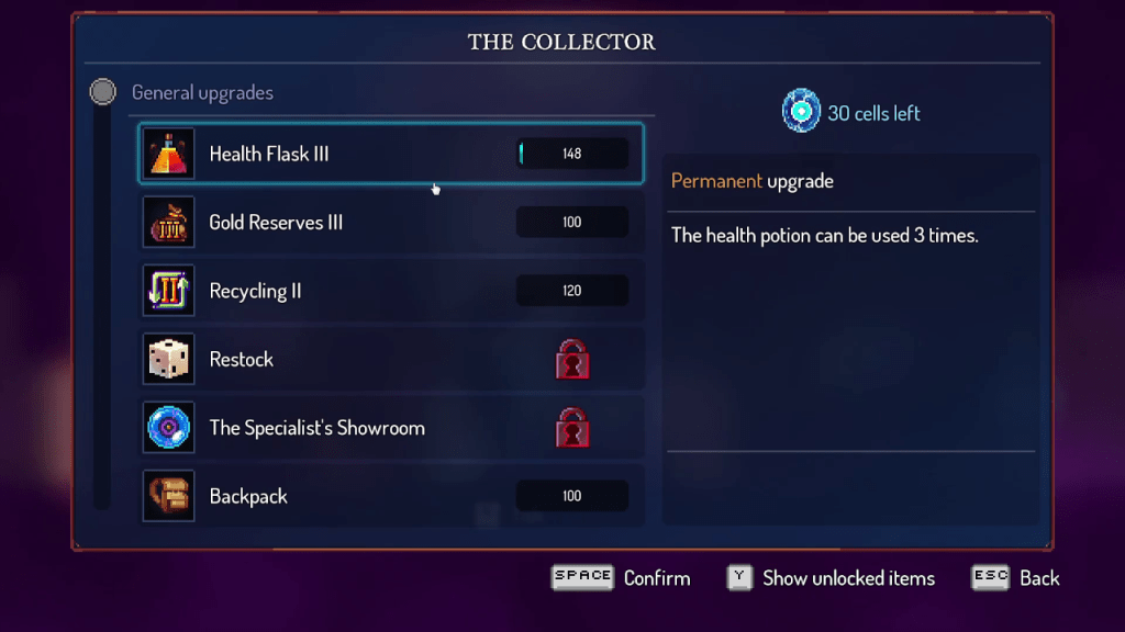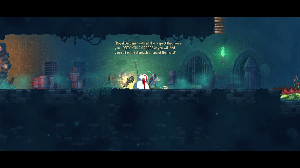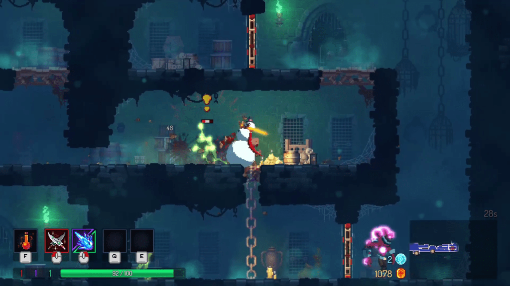 The game is a rogue lite in that some progression is saved after you die. You can invest cells earned from defeating enemies into upgrading general bonuses, such as more healing flask charges, to unlocking new weapons once their blueprints have been found. The progression is well balanced in that it doesn’t give you too much of an advantage while making the earlier portions of the game more manageable.