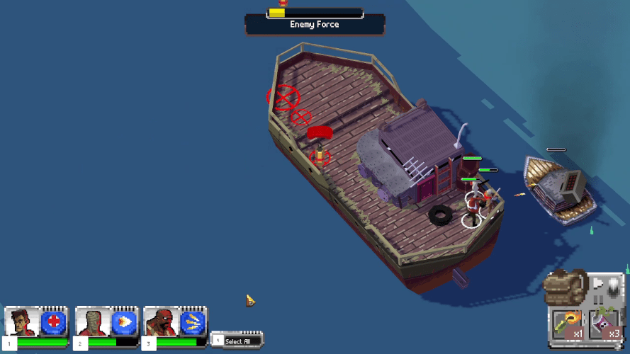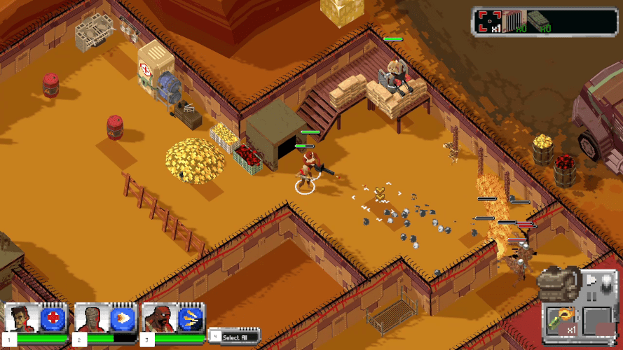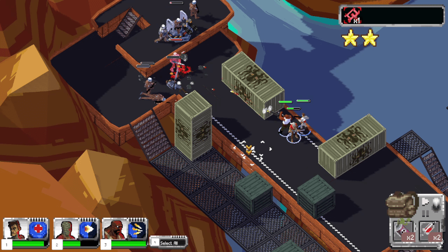 The game controls like a simple real time strategy game. You can select any combination of your three mercenaries and click on the map to move them to that location. You can select which targets to attack and each mercenary has one special ability. The special abilities can range from healing your entire squad instantly, to propping up a make-shift barrier to block incoming attacks, and a grappling hook to reach faraway locations. You recruit new mercenaries to your team by rescuing them from enemy zones.