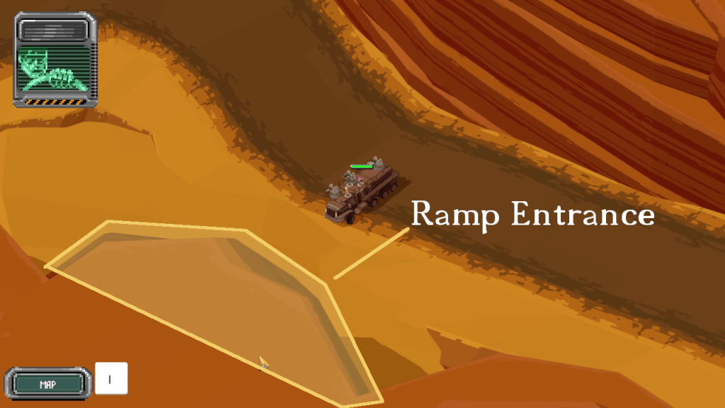 The ramp entrance is under the rock outcropping.