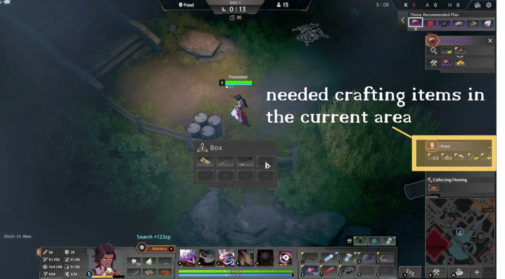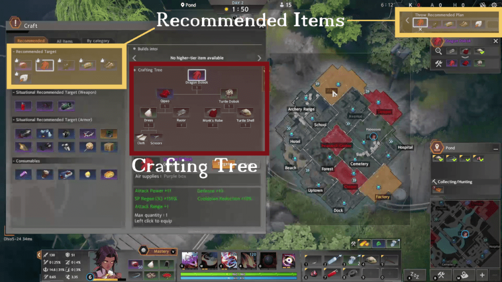 There are very intelligent and useful notifications on the screen to help aid the players in crafting their desired items. For new players, there are default item recommendations in place. For more experienced players, you can customize the items that you aim to build for. Not only that, each area on the map will indicate which resources are used in the recommended items list. This makes it so that at a quick glance, you know exactly what to look for. Not only that, you can click on any crafting component from the menu and it will display which locations on the map have that specific item.