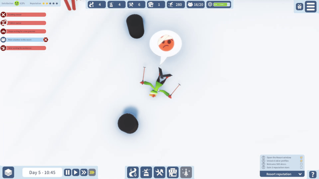 You start a round by picking one of several maps, each with its own difficulty level. The first and easiest map has three access points and is pretty easy to manage so I would suggest starting there. From each access point, you can build support buildings to help speed up construction, maintain slopes and ski lifts, and help skiers who have gotten themselves into a pickle.