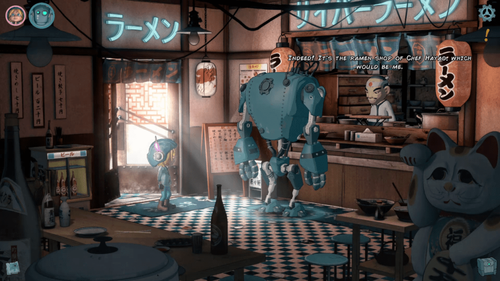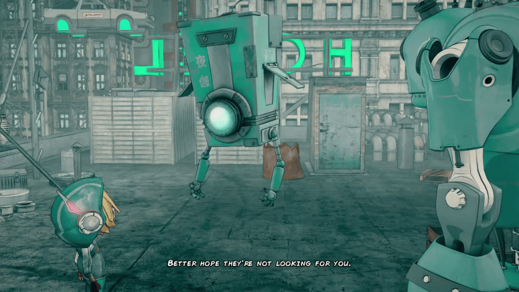 The game has a distinct visual style of 3D characters, a backdrop that looks 2D, and a faint filter that brings to mind the movie A Scanner Darkly. You get fairly animated backgrounds, and hear the hustle and bustle of a city set far in the future. It does make the world feel more alive.