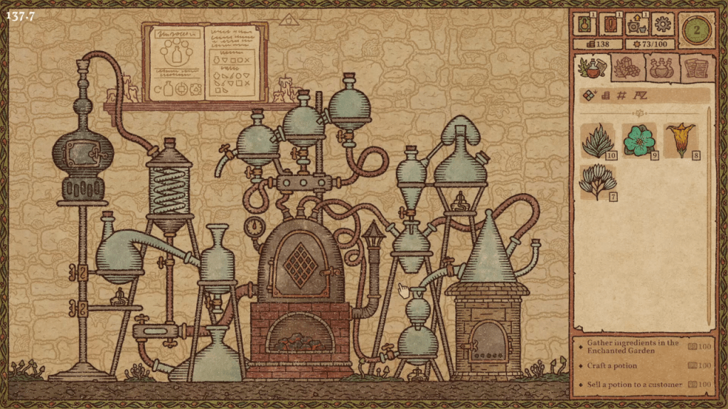 The game starts off like any farming simulator, such as Harvest Moon, where you take over a dilapidated home belonging to an alchemist and decide to set up a potion shop. From here, you can navigate to one of four currently available 2D panels. One is the shop, where you can interact with customers and sell them potions they require. The second is the workshop area where the actual brewing is done. The third is a garden where you harvest plants to be used as ingredients for your brews. The fourth is the bedroom, where you can go to sleep to end the day and start a new one. There is a basement with an alchemy device that provides more advanced mechanics but that was not available in the current demo.