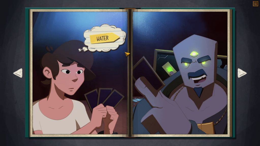 The last puzzle in the demo has you facing a burly man in a game of chance in order to win a coin to buy passage into the citadel. This sequence was particularly interesting because you had to do many things to solve the puzzle. It ended with you showing your entire hand to your opponent three times to make him angry and pound the table, which dropped the mirror behind him. This let you see what card he was going to play next. Then you intentionally lost each round to pick up all the words available and paged back to then beat him in the game with the right cards, now that you could see what he would play next.