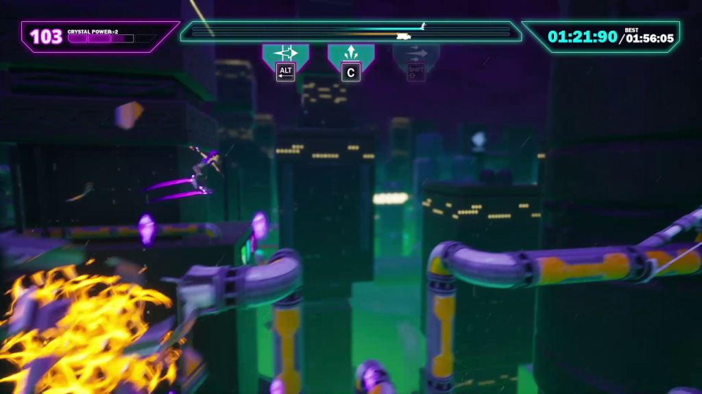 The full version of the game gives a glimpse of powerful kicks to let you speed run previous levels, randomly generated content for more replayability, and local multiplayer where your friends can try to impede your progress by breaking passageways or activating obstacles.