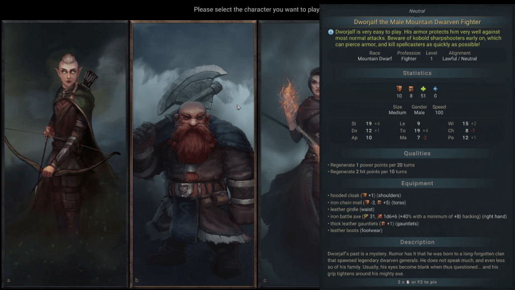 The game starts you off by letting you pick one of four predefined classes such as the Alynna the High Elven Archer, Dworjalf the Mountain Dwarven Fighter, and etc. The game will add in many new classes as part of its planned roadmap, such as the Barbarian and Necromancer. If a predefined character is not your cup of tea, you can create your own. Each class has different stats, equipment, and alignments. The combat system is dice based, so players familiar to such systems should feel right at home. Expect to miss a lot of hits if RNG is not with you.