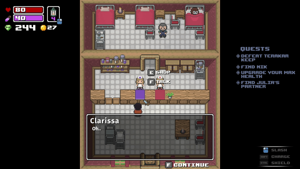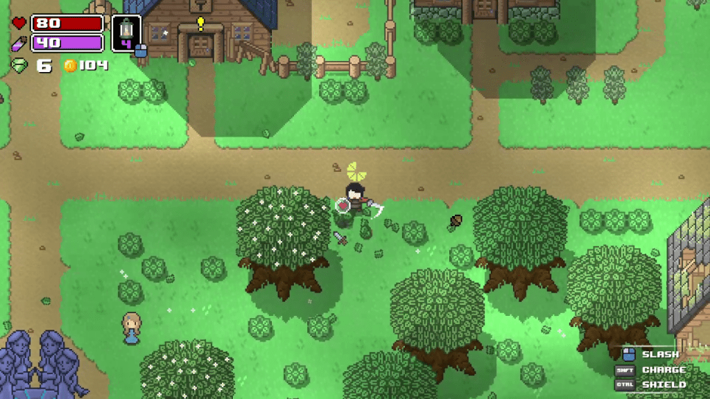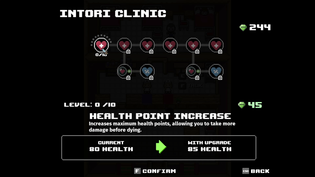 The game drops you off in a small town with only a few buildings and villagers. As you earn gems from exploring the dungeons, you can spend them to build up your town. You can build new buildings, such as the blacksmith and the clinic. These buildings are not just simply cosmetic but unlocks additional functionality as well. For example, the blacksmith will let you upgrade your weapons and the clinic will let you increase your maximum health. All of these upgrades cost gems of course. You can pick where to place the buildings, giving you a small degree of freedom over how your town will look.