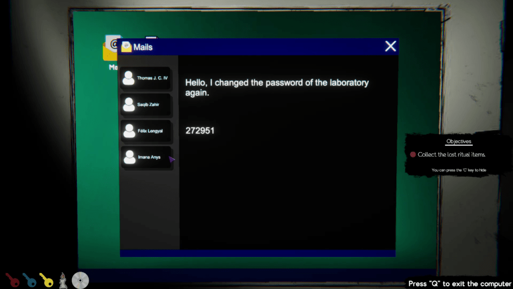 Head back out and continue straight until you hit the yellow lock. Go inside and grab the baby mask on the desk near the entrance. Go and grab the candle behind the flipped table near by. Go to the back and open the safe using the safe code and write down the OS serial key. Head out and back down the stairs to the first floor. The numbers are randomized each time you play the game so you can’t use the same numbers again.