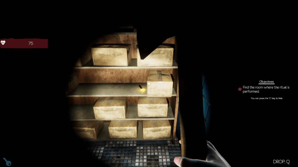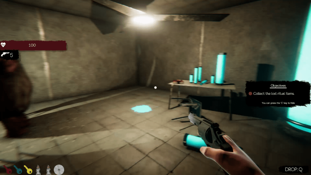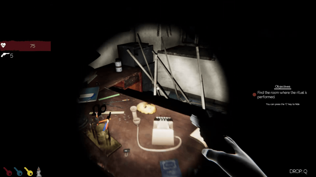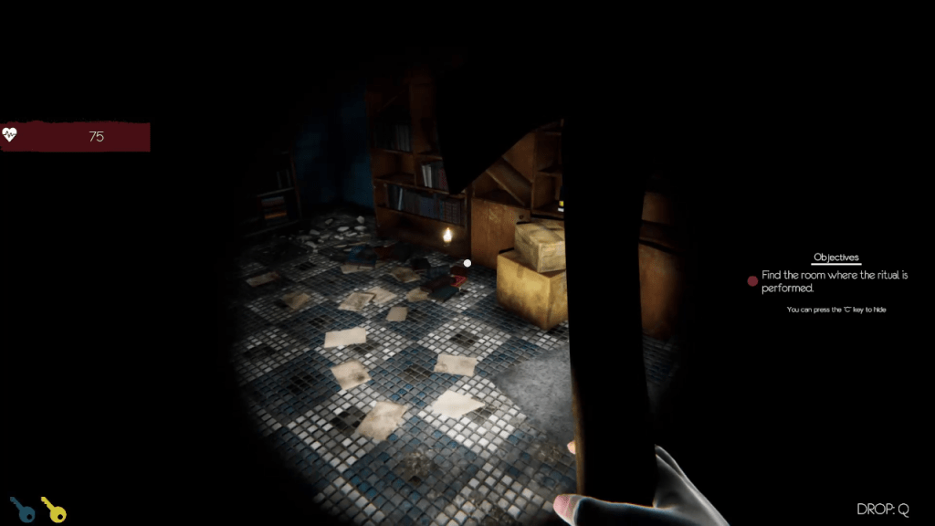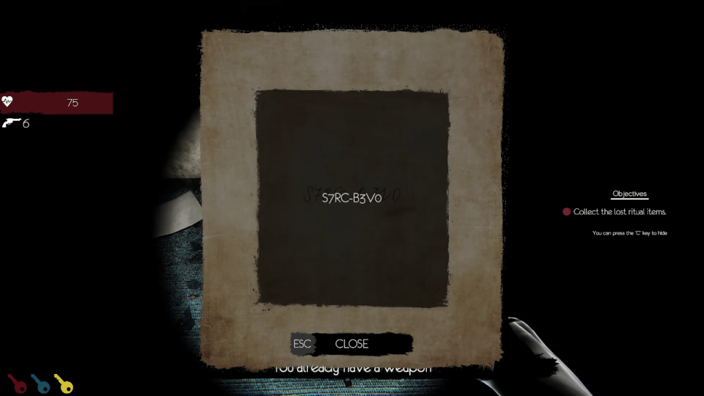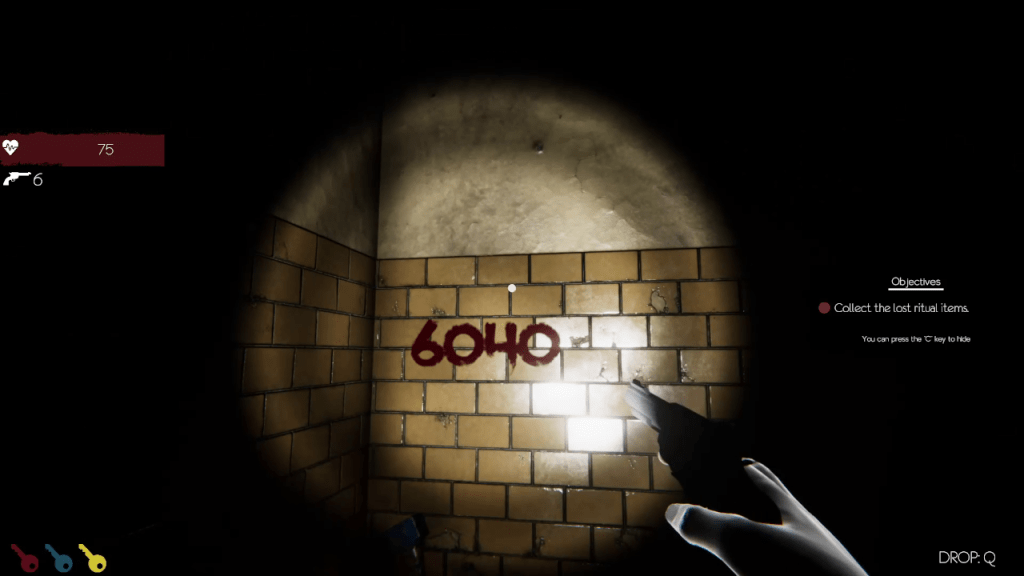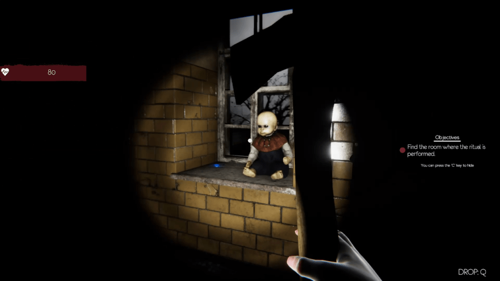 To start off, I would go straight to the third story, collecting all the bullets along the way. You can only hold six, so you can’t grab more than that. Grab the axe at the top and come back down to the second floor. The axe will let you down both the knife guy and the running lady but it does take a little bit of practice. The attack animation of the axe is slow so attack a little earlier than you think you need to. Once at the second floor, head right all the way down and look a the window near the wall on the right side. There is a pope baby and a blue key there. Take the blue key. Head back the way you came and go back down to the first floor. You can swap out to the gun once you are back at the first floor and just shoot the monsters. While you are exploring, make sure to shoot all the rats you see, there will be six.