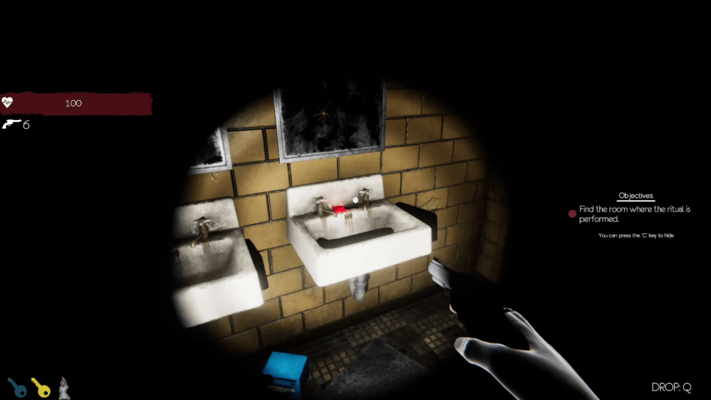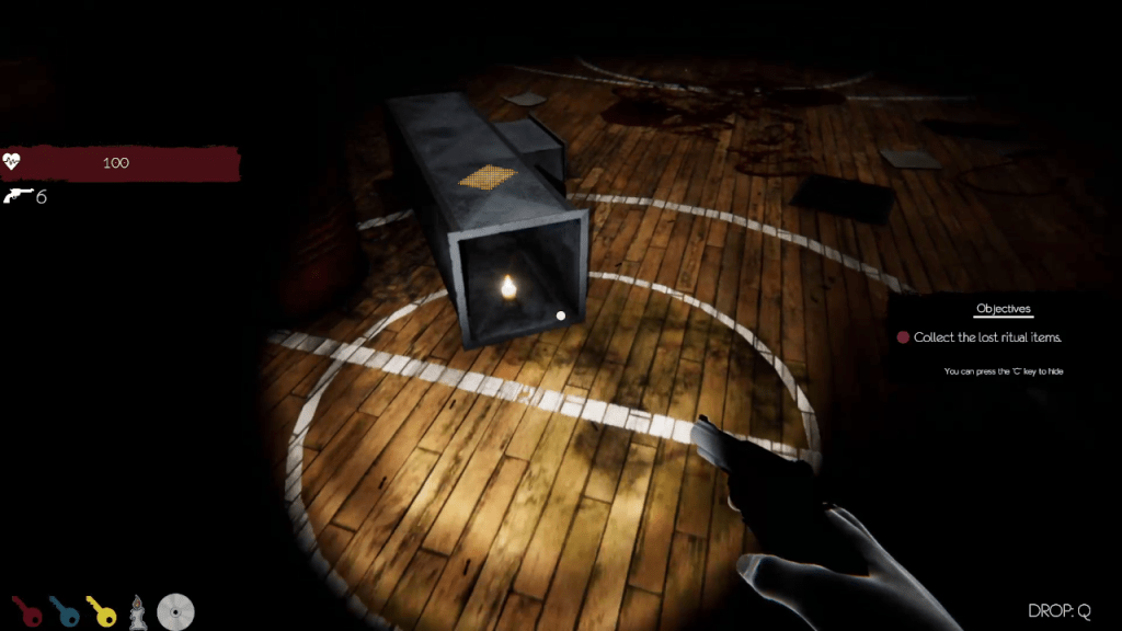 At the first floor, turn right and enter the classroom near the stairs. Go all the way back into the little storage room and take the yellow key on the right cabinet. As you exit the storage room, grab the candle on the right hand side near the back of the room. Continue to exit the room and head left. Go all the way around the hallway and past the door with the keypad. Going straight from here you should find the door to the bathroom. The red key is on the sink close to the entrance. Make sure to go to the last stall of the bathroom at the end of the hall and open it to find another candle. As you exit the bathroom, turn right and go straight to enter the gym. Make sure to take the candle near the center, inside one of the fallen ducts.