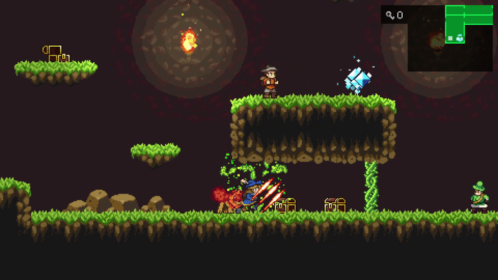The game has two main phases, exploration and combat. The exploration phase plays out like a metroidvania game. You explore a 2D world with branching pathways. Some pathways require a certain ability to pass through. For example, some pathways may be blocked by vines. You will need a monster that has an ability to cut down vines to proceed. You unlock new abilities by capturing new monster eggs, usually by defeating them.