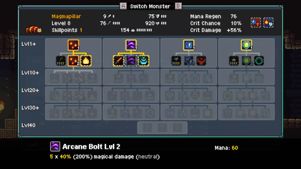 In addition to the unique combat system, the game has additional depth that separates it further from other games in the genre. The monsters have a surprising degree of customization. Each monster has a pretty deep skill tree. Each ability can be modified to suit your playstyle. For example, you can modify the heal ability on certain monsters so that it will also heal the weakest monster on your squad. Each monster can also equip one weapon and three accessories. These can boost or lower their attack, magic attack, defense, health, crit chance, crit damage, mana pool, and mana regen. You can also upgrade the monster equipment with crafting materials found in the world or purchased from vendors.