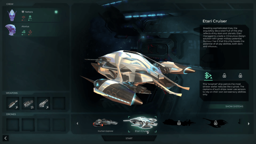 Before the game begins, you can pick your star ship and crew. There are two default star ships, each with their own advantages and disadvantages. The Etari ship and crew offer more firepower but are slightly more difficult to use because it requires more micromanagement.