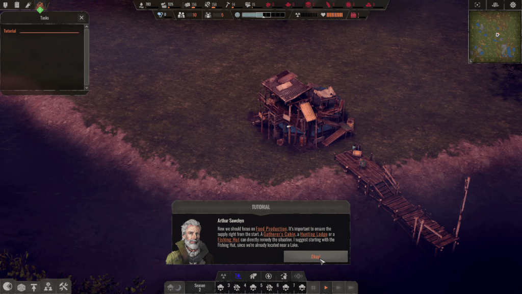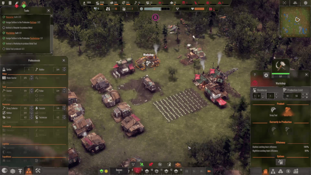 You start off with just a dilapidated bus and a few survivors. You have two resources your villagers can gather in the beginning, wood and scrap. They can be used to build structures and craft equipment. The consumable resources for villagers are food and water. You can gather them in many different ways. As is the case with most management sims, you don’t control the villagers directly. You mainly issue general orders and they are carried out automatically.