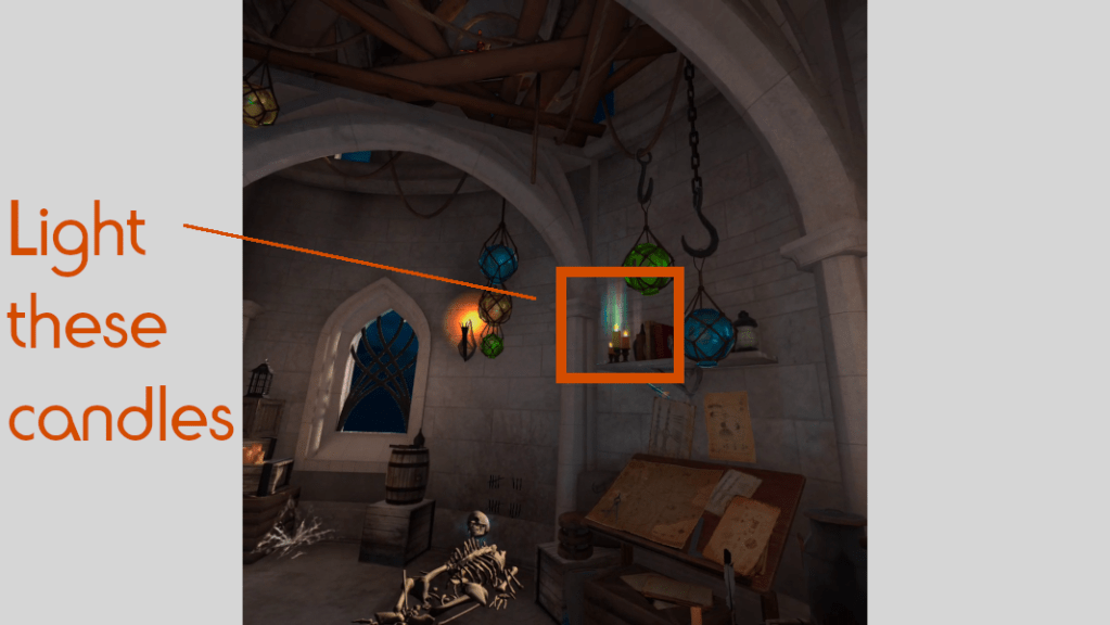 2. Use the lit twig to light the candles on the book shelf on the right.