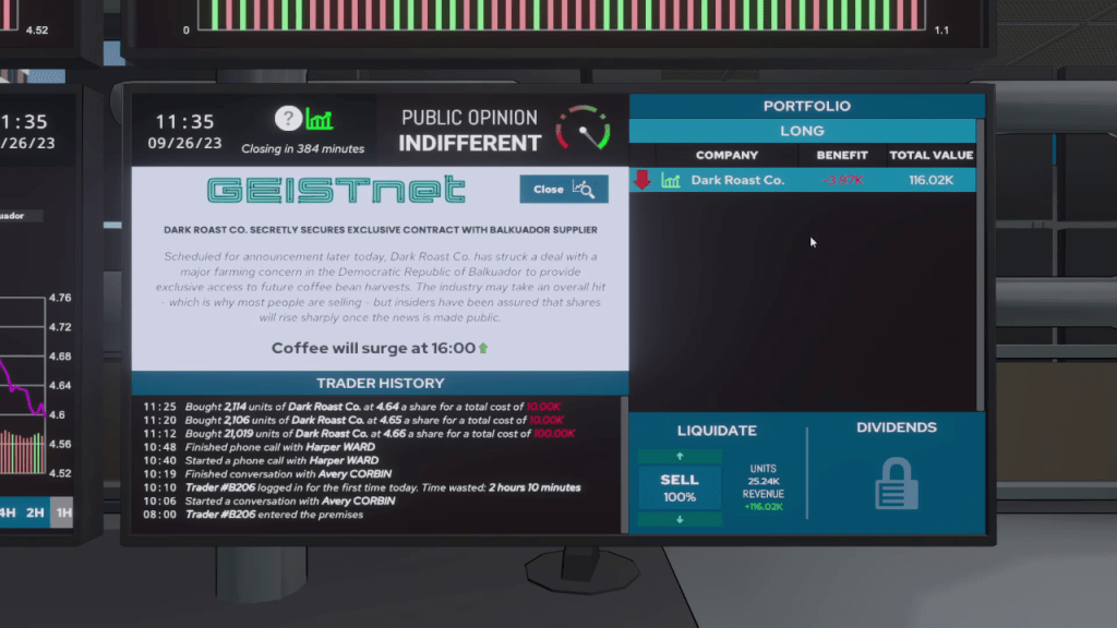 Overall, The Invisible Hand is a pretty neat game. The game gives a small glimpse into the world of investing in stocks for the uninitiated like myself. There is a loose narrative structure in place as well and the story goes places. I can compare it to games like Not for Broadcast and Papers Please. The narrative is not as crazy or in depth as those games but it does have some substance to it. It took me around three hours to complete the game and I found it to be an enjoyable experience.