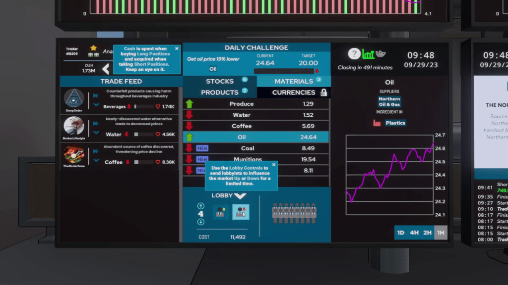 The game keeps introducing new mechanics such as taking a short position, earning dividends, and employing lobbyists to affect the market. You can combine these mechanics, such as shorting a stock, employing lobbyists to make sure the stocks drop, and taking a long position on a competing product, all in the name of profit.