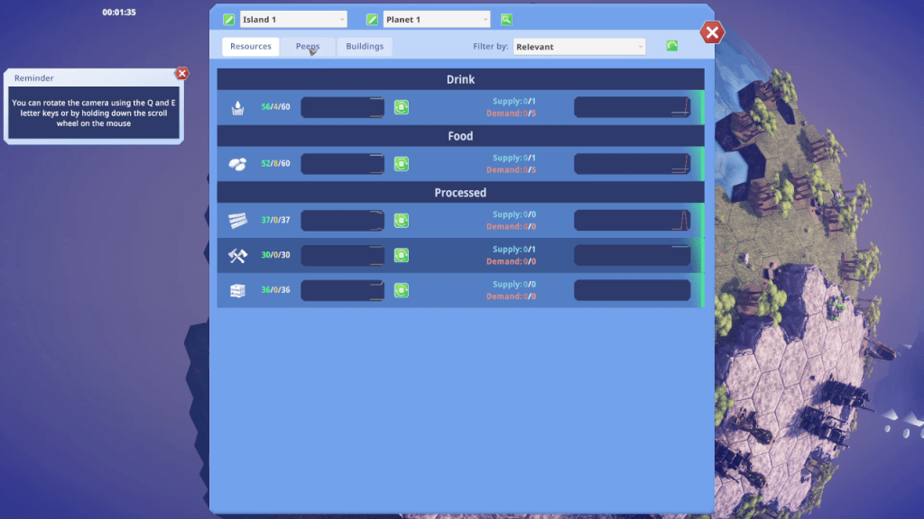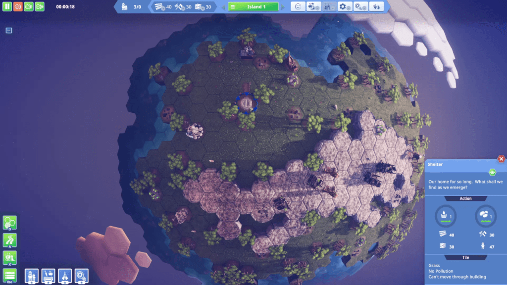 When the peeps emerge from the underground shelter, you find yourself on a lush island. Here, you can start building your village out, growing vegetables and collecting water to keep your peeps fed and happy. You can also harvest wood from nearby trees, and collect stone from nearby piles of rocks.