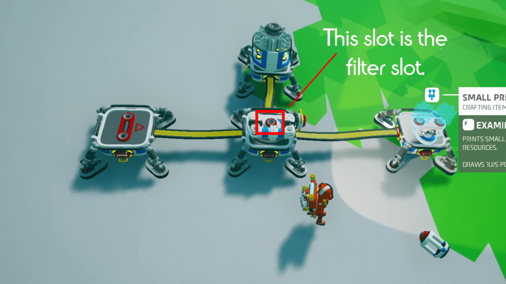 You can filter what the auto arm grabs by placing an item or resource into the top slot of the auto arm, as shown below.
