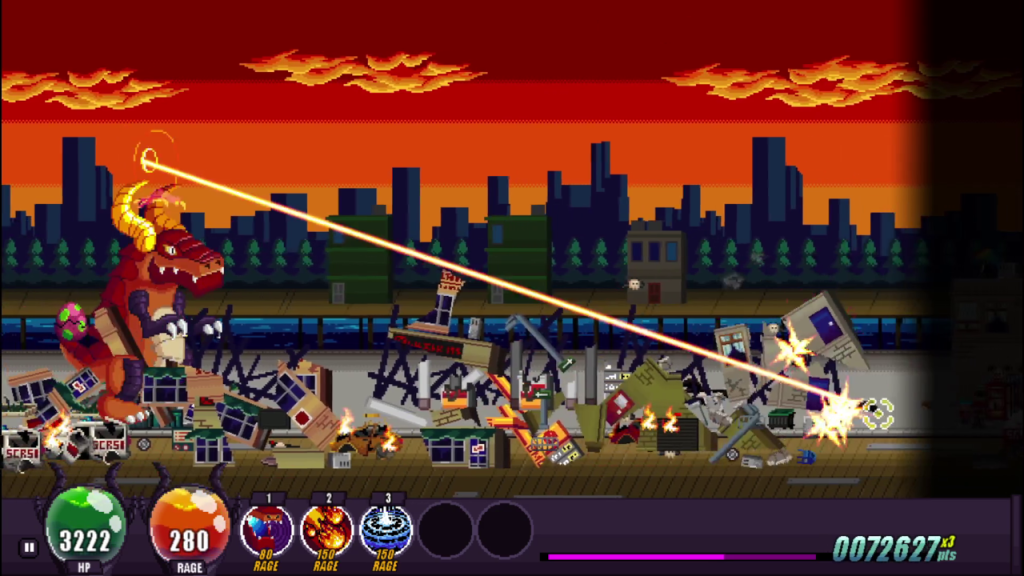 The game is structured very similarly to a roguelite. Your Kaiju will walk forward automatically and you can execute a melee attack, a ranged attack, or special attacks. All attacks consume rage and rage is generated whenever you deal or take damage. As you progress through the cityscape, the humans will attempt to stop you in any way possible. The first few times will be difficult as you don’t have a lot of health or deal enough damage. You will definitely end up dying the first few runs.