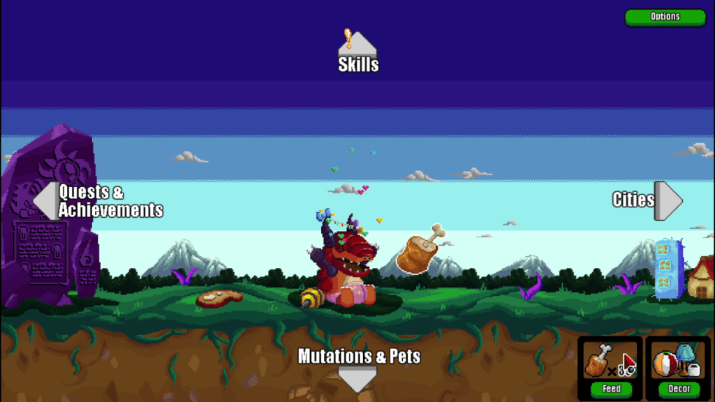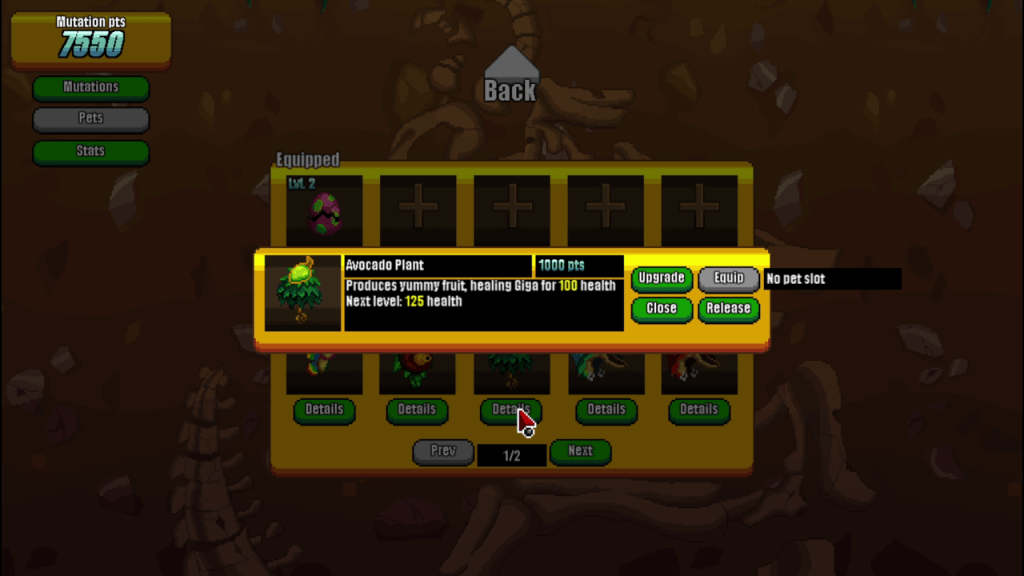 After each run however, you earn mutation points. The mutation points can be spent to purchase passive upgrades to increase damage or health. You can also spend the mutation points to assign and upgrade pets to your Kaiju. Pets are autonomous units that aid you in your quest to destroy everything by automatically attacking enemy units or providing healing.