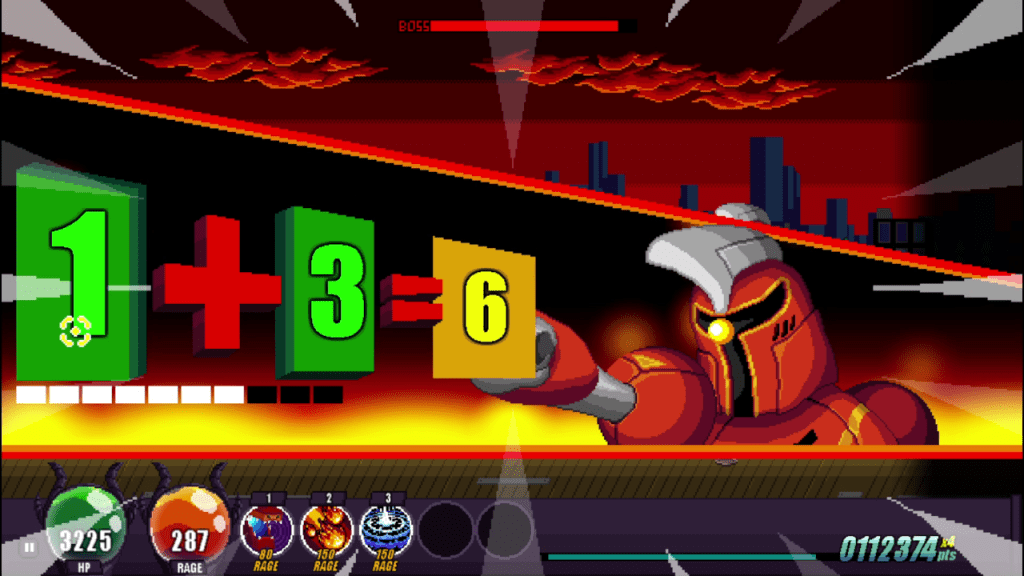 Each level culminates into a boss fight. The first boss is a giant mech wielding a sword and shield and math. Yes math. For some reason the boss will give you random math problems during the fight. I found it to be quite random and hilarious. The game is chock full of silly little flourishes that add to the experience.