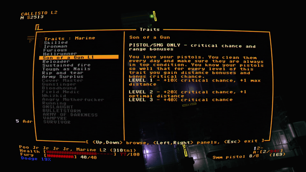 The game will let you have up to three weapons equipped. They all have different optimal ranges, damage, and clip size so you can pick up the ones that suit your play style. As you level up, you can also level up skills which give you passive bonuses. There’s a nice balance between offensive, defensive, and technical bonuses so there’s a degree of freedom in how you can approach the game. My personal favorite is the Son of a Gun trait because once you level up it high enough, you can use two guns at the same time. More guns is definitely the solution here.