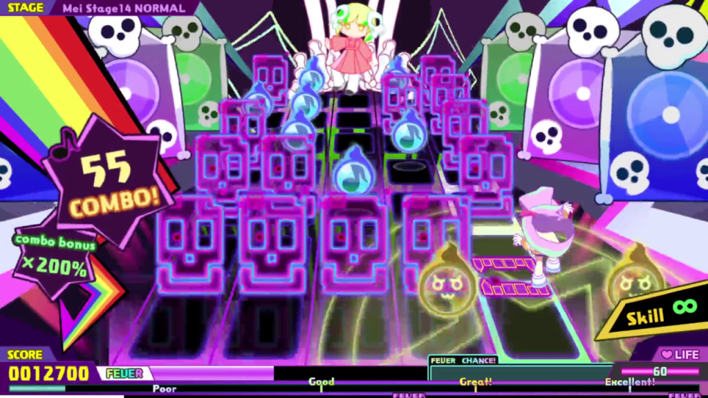 Moving around the levels now requires more precise timing. In addition to having a smaller margin of error, they threw in hazards that you need to jump over. The note layout grew significantly more complex as well. In the later levels you must now change the color to yellow or blue to match the notes. Having to keep track of everything together, especially when the song is set to a faster bpm, is especially difficult.