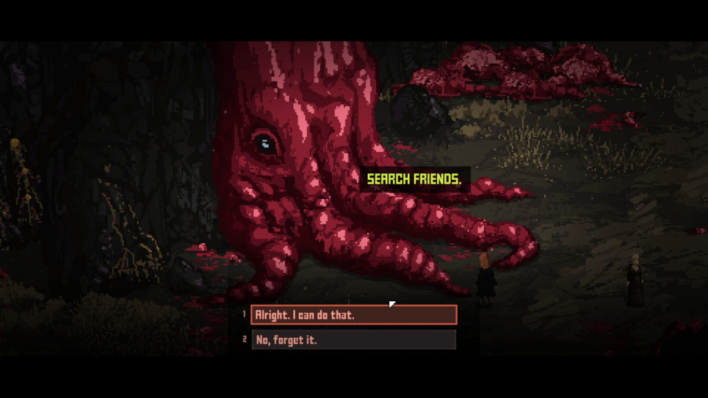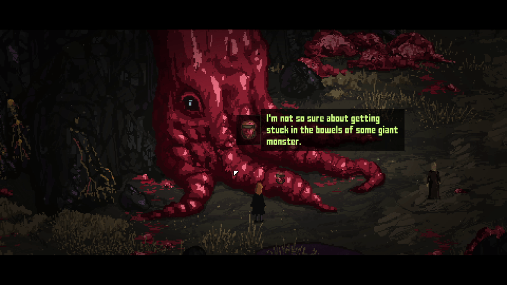 For example, one small side quest starts when you find a giant meat kraken outside your previous home run by robots. You’ve been kicked out permanently due to some contagious sickness. Nothing’s really explained at the start so you just have to roll with it. The kraken takes an immediate liking to you and now you’re friends. He then gives you a quest to find new friends. There’s a lot involved but to make things short, you end up ripping a cyborg’s head off and feeding it to the kraken.