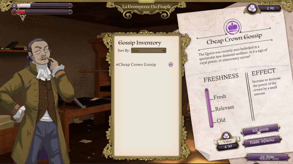 It doesn’t stop there though. You can choose to sell gossip for money or give it away for free to influence the general public’s opinion on a certain faction positively or negatively. Doing either will carry the risk of you being found out as the source of the gossip and possibly losing credibility.