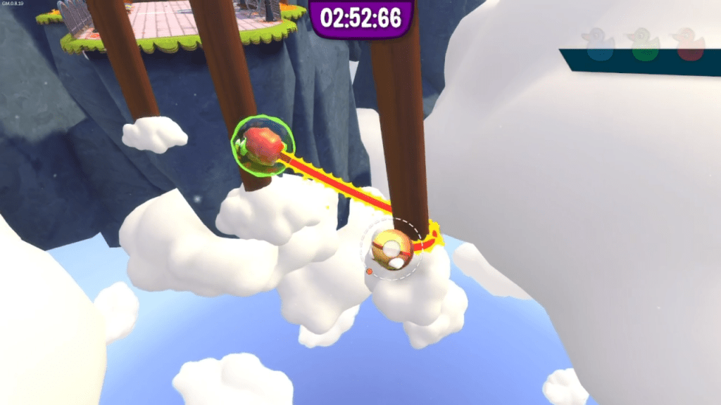 The platforming requires a great deal of teamwork to make it to the end of each level. Each ball can move, jump, stick to surfaces, and fling your teammate. The later levels have obstacles that require intricate timing. For example, one level had a series of vertical poles floating in the air. One person had to fling the other to the pole, have the flung person stick to that pole, and then fling the other person to the next pole and so forth. It sounds easy but one mistake will lead to both of you falling to your deaths.