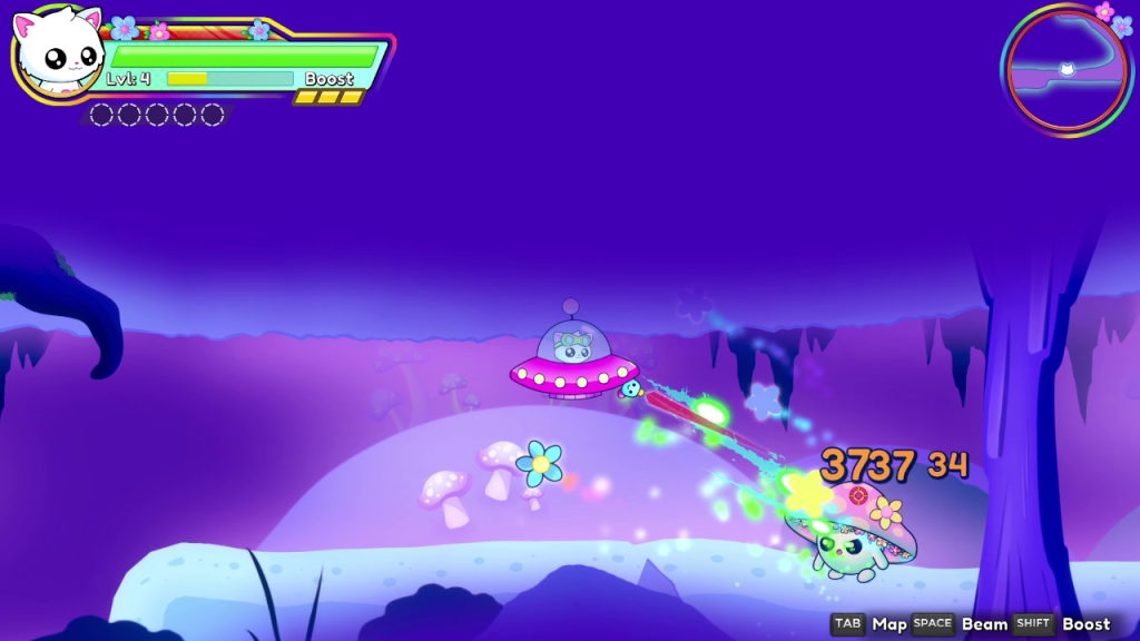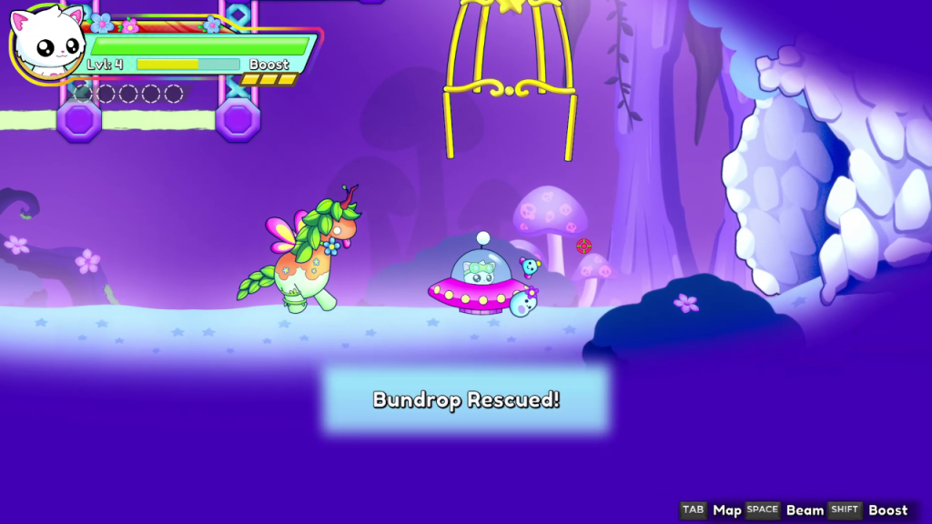 The mechanics of Flewfie’s Adventure is very straight forward. You control a UFO that shoots bullets (even the bullets are cute), grabs items via a beam, and can gain a temporary boost in speed to help avoid enemy fire. You fly through each level, defeating enemies and solving simple puzzles, with the main objective of reaching the end of the level.