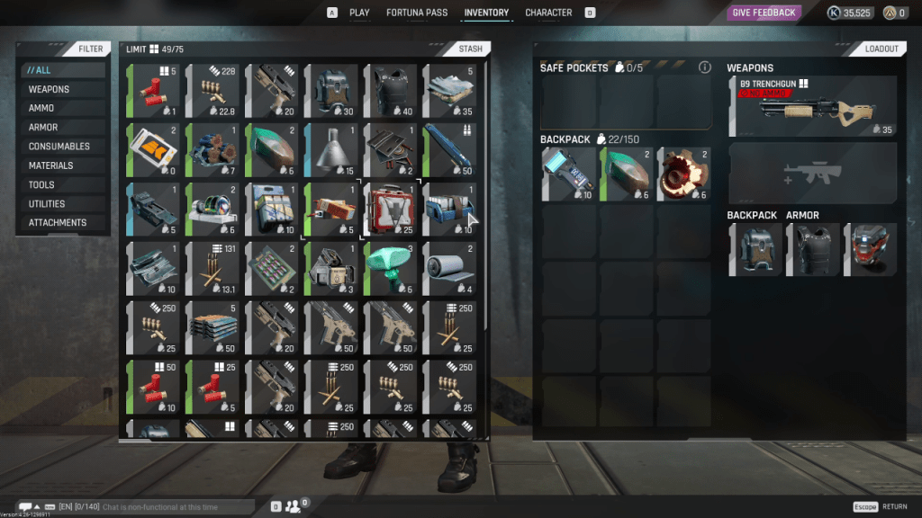 Now, the current version of the game has removed most of the movement abilities. You have a slower sprint that uses a stamina bar and crouching while running will only let you slide a short distance. The game is also much more slower due to the design. Since you are bringing in gear every time you drop to the surface of Fortuna III, and you lose everything when you die, you have to play in a much more safe fashion. You do have a small safe pocket where you won’t lose those items when you die but you can’t carry much there.
